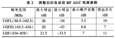 根据低噪声放大器(LNA)和各波段RF AGC电路的增益调节,计算出MAF输入端接收到的信号范围由-110~-10dBm分别压缩至-64~-24 dBm、-70~-33 dBm和-68.5~-23.5dBm,其总的信号动态范围是-70~-23 dBm,压缩了63 dB,增益控制范围不变。同时由于最大增益和最小增益都减小了20 dB,相当于为IF AGC电路提供了40 dB的增益调节范围,且IF AGC的最小增益为20 dB。