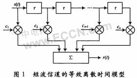 通过上述分析可知,短波信道在时域和频域都是时变的。根据对短波信道特性的统计分析,接收端接收信号的幅度服从Rayleigh分布,接收信号的相位服从(0,2π)均匀分布。假设分析只限于有限频带和足够短的时间,可以认为信道基本上是稳定的,从而可以选用等效离散时间模型来表示,如图1所示。