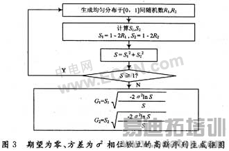 式中c≠0,增量c与模数m互质,a称作乘子,a-1必须是模数m任意一个素因子的倍数,如果m是4的倍数,则n-1是4的倍数,发生器的最大周期为m。各项参数本文采用了标准C语言的定义,即m=232,c=12345,a=1103515245。以混合同余算法为基础,经过适当的变换即可得到高斯分布随机序列,具体实现流程如图3所示。