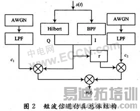 短波信道仿真总体结构是由高斯噪声生成器(AWGN)、低通滤波器(LPF)、Hilbert变换以及等效离散时间模型组成。