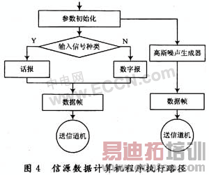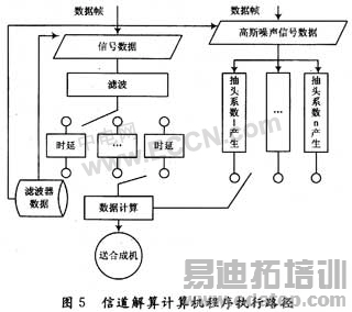 图5显示了运行于信道解算计算机上的信道算法(如短波信道的多径、衰落等)模块的程序执行路径。系统启动后,程序进入等待状态,由信源数据计算机触发运行。