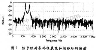 针对综合通信训练模拟系统结构复杂、数据运算量大、实时性要求高等难题,本文给出了一种分布式仿真的设计方案。该方案充分利用了综合通信训练模拟系统中的计算机资源,实现了对传输信号的实时处理,能够实时模拟通信信道环境。图6给出了频率为500 Hz的原始输入正弦信号谱,图7则是500 Hz正弦信号经前述短波信道模型(两条路径)的计算机仿真结果图,可以看出原始信号变为有两条多径,并且每一条多径信号被分别加上了不同的多普勒频移和频扩。这一仿真结果与理论分析相吻合,从另一侧面验证了设计方案的正确性和合理性。