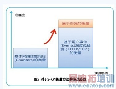 另一种方法更加直接且准确,就是在手机终端安装测量程序,直接从终端进行S-KPI的衡量,其他网络资源数据进行后期的根原因分析支持。这种方法思路简单,直接面向用户,但终端约束较大,难以大面积推广。目前被运营商用于拨测和用户投诉反馈,以校对网络性能指标测量结果并定位网络问题。当然将来随着用户需求的细化,手机侧具备自检能力并定期与运营支撑系统进行沟通、提高用户服务能力,也是一个很有价值的实践。图5描绘了对于S-KPI衡量方法的演进过程。