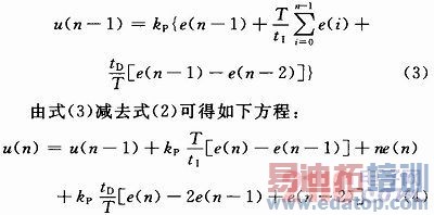式中:T为采样周期;e(n)为第n次采样的偏差值;e(n-1)为第n-1次的采样偏差值;u(n)为第n次采样输出值。为使系统具有足够高的精度,必须将采样周期设定的足够小。由式(2)可以看出,如果要得出第n次输出值,需要处理的数据非常庞大,不仅需本次与前一次的偏差信号,而且需要从第一次到第n次的采样偏差值,再将其累加求和。在这一步骤当中,对微控制器所需的内存会有一定要求,并且其计算量繁冗。因此,对其进行化简,由递推原理求得第n-1次输出值,如下: