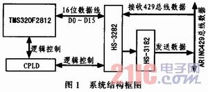 本系统主要是实现ARINC429总线数据信息的接收和发送。本系统中采用TI公司的DSP芯片TMS320F2812为控制核心和CPLD芯片作译码电路控制429数据收发芯片时序逻辑,配合1片高性能ARINC429数据收发芯片HS-3282和1片ARINC429数据发送驱动芯片HS-3182,形成1个数据接收通道和1个数据发送通道,由它们构成数据收发、串/并、并/串转换的主体,其系统结构框图如图1所示。
