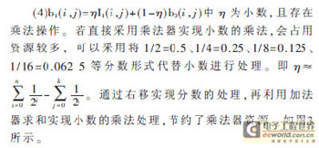 更新背景算法模块RDA有效后的第2个CLK的上升沿时启动有效的判断,若输入的I1(i,j)与b0(i,j)满足Ik(i,j)<T1,则将此时的背景像素值变换为b1(i,j)=ηI1(i,j)+(1-η)b0(i,j),否则b1(i,j)=b0(i,j)。当求出第一个新的背景值b0(0,0)时,更新背景算法模块同时使RAM C写端口WRC有效,将b1(i,j)输入到RAM C暂存。在第三个CLK的上升沿,启动RAM B读端口Qb的使能信号RDBb和RAM C读端口Qb的使能信号RDCb有效,同步读出当前帧的图像数据I1(i,j)和更新后的背景图像数据b0(i,j)。此时第M+1帧的有效图像数据和当前帧的背景图像数据同步输出到差分模块中。利用流水线方式,依次将第M+2帧及其以后的图像数据存入到RAM B中,并利用RAM B和RAM C进行背景更新,将更新后的背景数据与当前帧数据同步输出。这里以η=0.875,即η=1/4+1/8来进行硬件设计,SEL用于判断是背景值不变还是背景像素需要更新,DELAY用于保证数据的同步性。算法结构如图6所示。