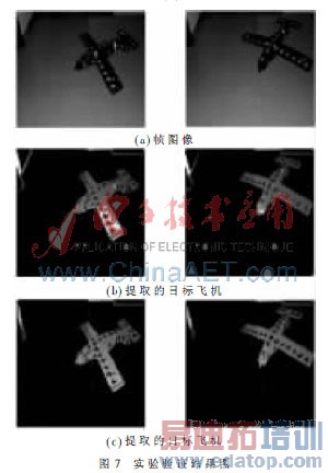 图7(a)为模型飞机在不同运动时刻不同姿态的帧图像;图7(b)为固定阈值背景更新、更新速率为0.875时所提取到的目标飞机;图7(c)为动态阈值背景更新、更新速率也为0.875时所提取到的目标飞机。可见动态阈值能更有效适应动态环境运动目标物体的提取。