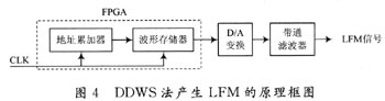 DDS技术又可进一步分为直接数字波形合成(DDWS)和直接数字频率合成(DDFS)两种,二者在实现结构上略有不同。DDWS也称为数字波形存储直读式波形产生系统,它把经过理想采样的数字波形预先存储,使用时通过查表进行D/A变换而得到所需的模拟信号。该方法产生的LFM信号基本上不受调频斜率的限制,可以用来产生任意波形(包括复杂波形及大数据量组合波形),还可对预先存储的数据波形进行预失真处理,提高系统的性能。本设计采用DDWS方式产生LFM信号,产生LFM的基本原理框图如图4所示。