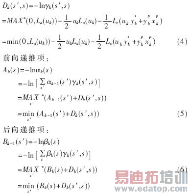 为对MAP算法进行简化,通常将运算转换到对数域上进行,避免了MAP算法中的指数运算,同时,乘法运算变成了加法运算,而加法运算用雅可比公式简化成MAX*运算[4]。