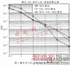如图1所示,帧长为128,迭代6次,BER=10-5的数量级时, MAX-LOG-MAP算法的译码性能比MAP算法差大约0.6dB,比LOG-MAP算法差0.2dB左右。所以,本文采用3GPP的交织和(13,15)编码方案,MAX-LOG-MAP译码算法进行短帧Turbo码译码器的FPGA实现与设计。