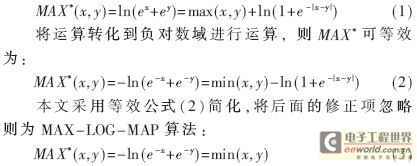 将运算转化到正对数域进行运算,则MAX*可等效为: