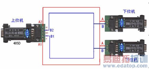 波仕的485D是一种具有单环自愈功能的1路RS-232到2路RS-485的转换器。RS-485总线可以是直线或者曲线,但是不能绕成为环形。有了波仕485D转换器将1路RS-232转换成为2路RS-485的转换功能后,RS-485的2路输出开叉成了2路并在远端闭合。这就是单环自愈的RS-485组网。如图7所示。图中虽然有两根RS-485信号线(红线A和兰线B),但是它们实际上都是一个环路的RS-485信号,所以称为单环。自愈的特性表现为:当RS-485信号线有断线时,比如图中的红线A和兰线B中有一根断开甚至两根都断开时,任何一个下位机的RS-485的信号A仍然可以从没有断开部分的红线连接到485D的A1或者A2、任何一个下位机的RS-485的信号B仍然可以从没有断开部分的兰线连接到485D的B1或者B2。波仕的另外一款产品BM2485A也具有单环自愈的RS-485组网功能。