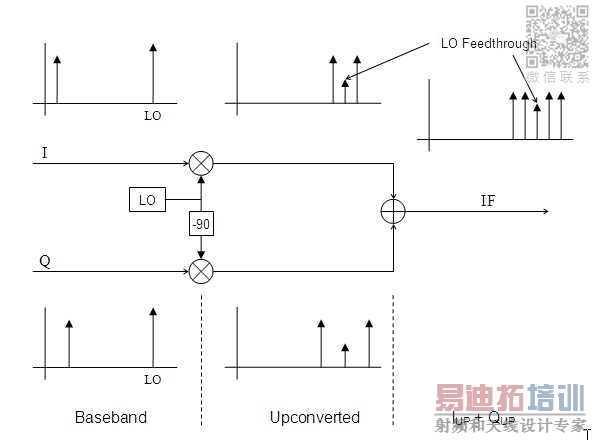 The default LO to RF/IF isolation is 25 dB, which is set through the LO2OUT parameter. When upconverting from baseband, the LO feedthrough falls in the middle of the upconverted spectrum.