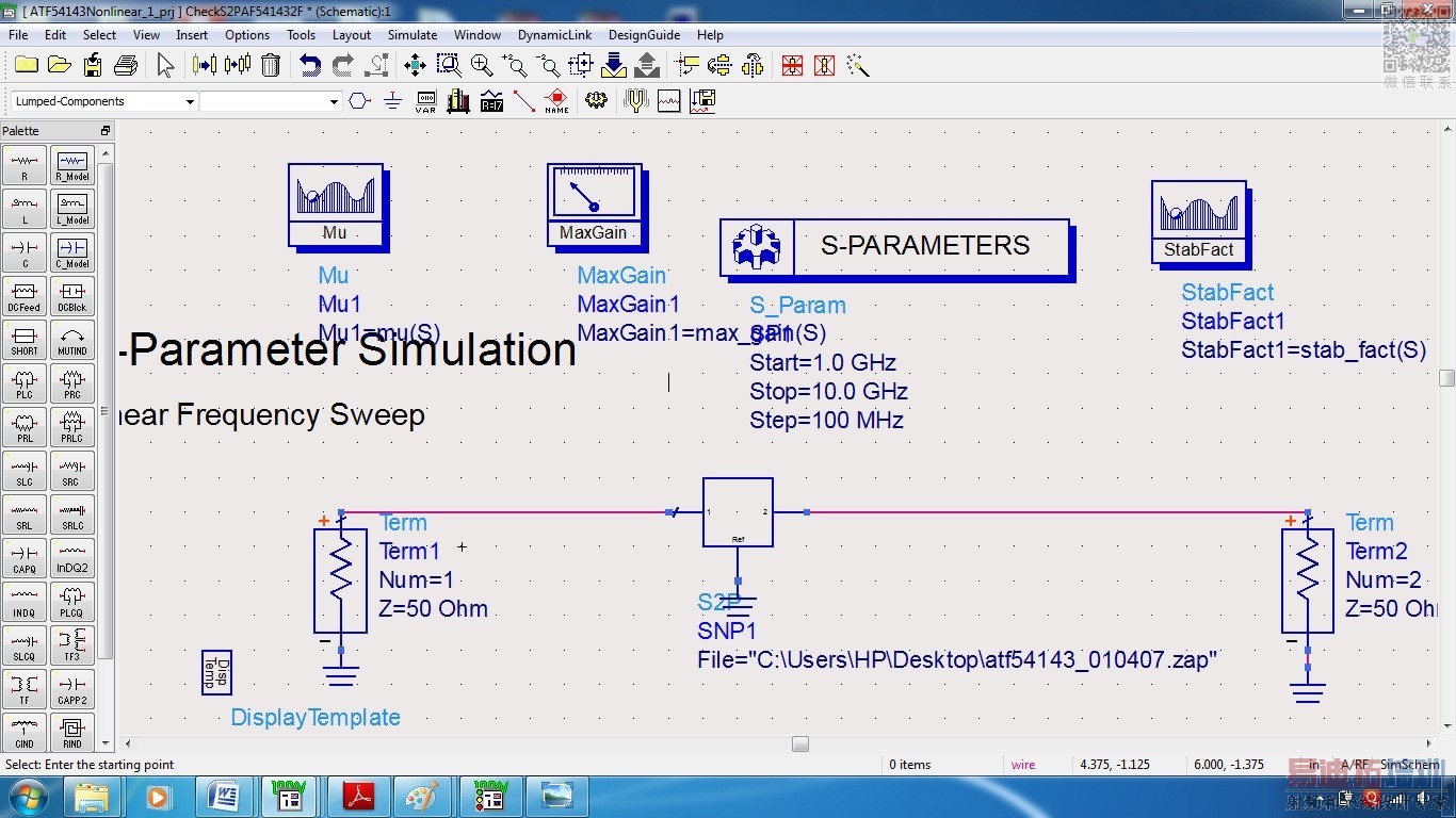 As you said, I downloaded the ATF 54143 ADS nonlinear device model from the Avago website. File is in the .ZAP format that file is pasted on the desk top and shown the path for the data item , it is showing the follower. Please help me to remove the showing error ,because I am beginner to ADS 2009. Meanwhile I created nonlinear ADS model device model as shown in the datasheet of ATF 54143, it is not working upto the mark. I am attaching two related images.