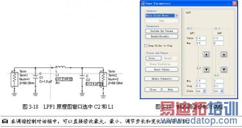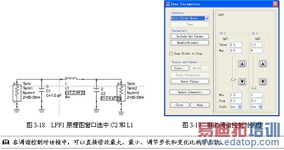 (3)在“lpf1”原理图窗口中选中L1和C2,如图3-18所示,调谐参数对话框变为图3-19所示的样式。