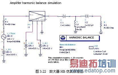 (3)在顶层电路原理图中,双击“Harmonic Balance controller”可进行谐波平衡控制器参数设置。由于调用的“HBtest.dsn”为范例设计,所以控制器谐波设置为计算5次谐波,基频信号频率为960MHz。
