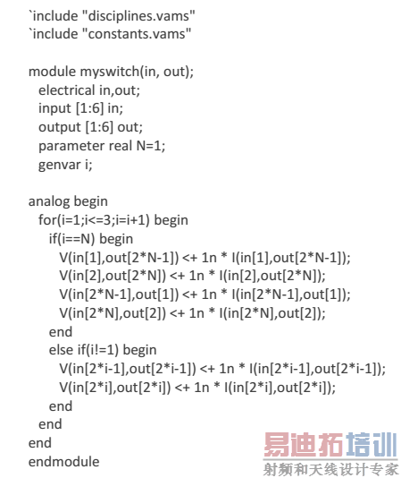 开关组件是用Verilog-A代码构建的用户定义模型。三通道开关组件的代码如图4所示。代码可以修改,以构建更复杂的开关组件。
