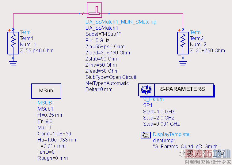 (5)设置Term1阻抗为Z= 55-j*40Ohm,Term2阻抗为Z= 30+j*50Ohm,这里以Term1作为源阻抗,Term2为负载阻抗。再将S参数的扫频范围设置为1到2GHz,步长为0.001GHz,设置完参数的原理图如图3-43所示。