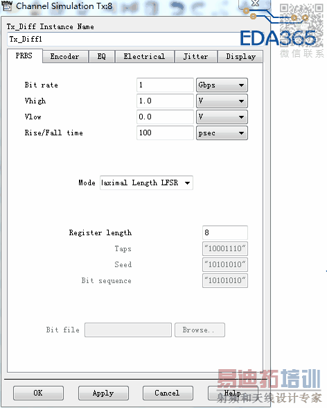 信号低压为 0, 高压为1,延时为 0ms,上升下降时间各为1ns,速率10Mbps,种子(seed)为3(00011)
