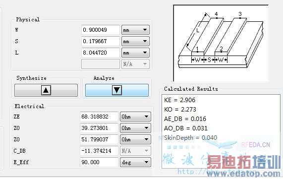ze和zo分别是偶模阻抗和奇模阻抗,你计算耦合微带线的时候,只需要知道这两个阻抗值就可以了,z0的大小可以根据这两个计算出来。C_dB是耦合系数,微带线之间的距离是根据这个来计算的,E_Eff是对应的电长度。