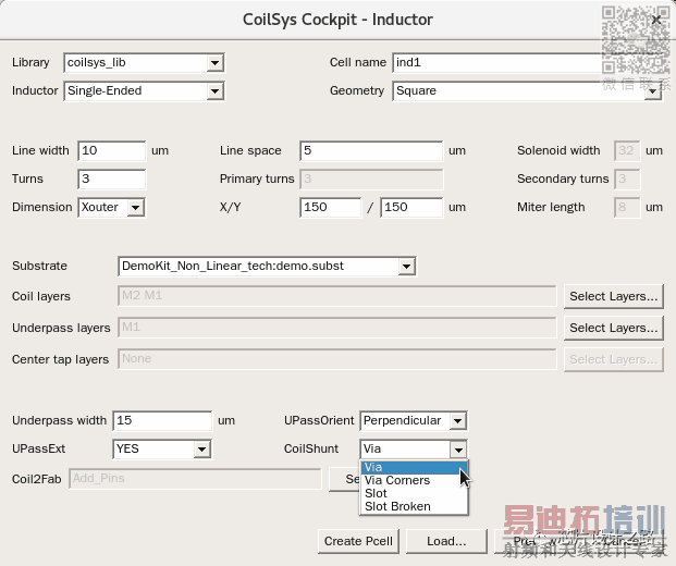 定义好使用到的金属图层、过孔图层、DRC规则以后,启动Coilsys的工具窗口。选择新生成的元件放到哪个元件库(Library)中、元件名称(Cell name)、电感类型(Inductor)、几何形状(Geometry)。
