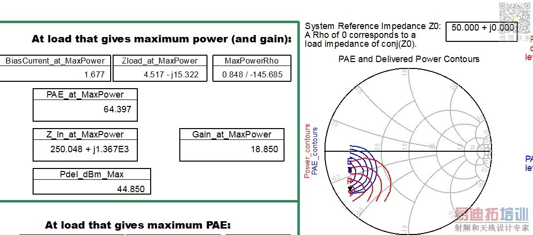 According to load pull in ADS (the below figure) if I adjust zin=250+j*1360 and zload=4.5-j15.32 I wil get PAE 64% and Pload= 44dBm.