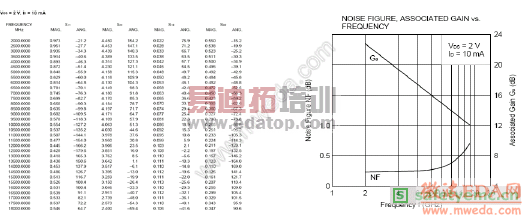 1.首先选择合适的器件。选择适用于工作频率且具有可接受的增益和噪声系数的BJT、JEFT 和MESFET。工作频率在6GHz 以下时,大多使用双极晶体管;工作频率在6GHz 以上时,大多选用场效应晶体管。而且,通常要求晶体管的截至频率大于或等于2-3 倍的工作频率。低噪声放大器则要求截至频率更高一些。本文选取NEC 公司低噪声产品系列的