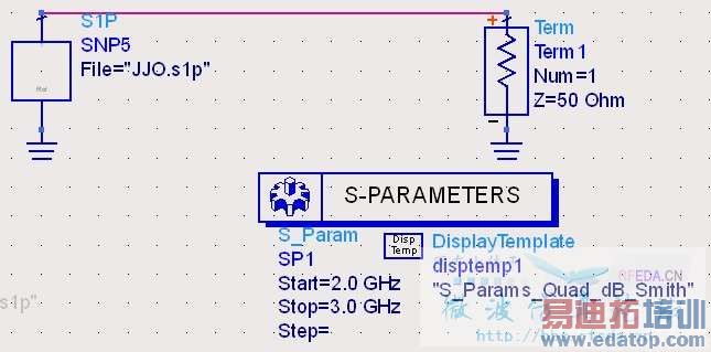 先在库中找到s1p这个器件,s1p文件要放在project中的data文件夹中,然后双击s1p元件,让路径指向那个s1p文件,s参数仿真就可以还原网分测的结果了