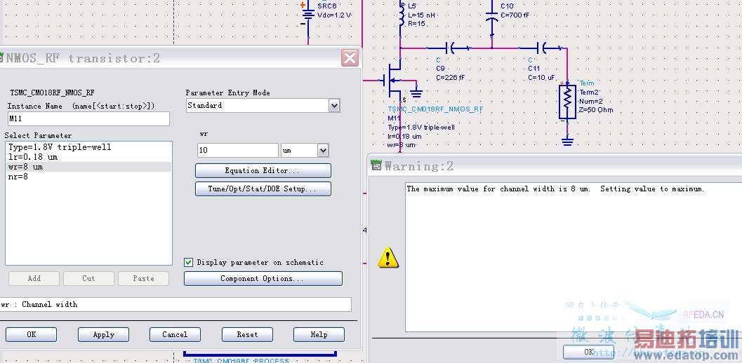 小白刚开始学习ads,仿真了一个LNA,但是遇到一个warning,不知该怎么解决,求助。另外,所选的那个RF-NMOS的wr说最大只能设置到8um,请问有什么办法能更改限制吗?还是说这是由元件库决定的改不了了?