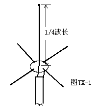 图TX-1是这种天线的结构图,这是一种平面接地天线,此天线由一根垂直受激励的1/4波长振子组成,振子与一个人工地面有关系,人工地面由四根水平放置的,而且在电气上是接地的辐射棒组成,辐射棒与地面的夹角不同,天线所呈现的阻抗也不相同,如,与地平面平行时阻抗为34欧;与地平面为45度时,阻抗为50欧。