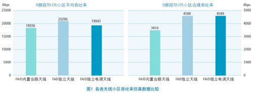 FA/D双频独立电调天线的FA频段与D频段双网独立电调特性,可以解决覆盖差异及干扰问题。FA/D双频独立电调天线可以针对FA频段和D频段独立调整天线下倾角,使不同的频段达到同样的覆盖效果,同时,电下倾相对机械下倾不会造成方向图畸变,可以有效提高小区边缘吞吐率,保证不同场景下TD-LTE网络性能最优。如图1所示,成都实际城区场景仿真表明,FA/D双频独立电调天线网络性能与FAD独立天线相当,相比FA/D内置合路非电调天线,在保持小区平均吞吐量的同时,能大幅提升小区边缘吞吐量30%以上,实现无处不在的LTE网络覆盖。