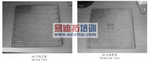 图4所示为天线的正反面结构示意图,正面所示为天线的辐射面,反面所示为天线的功分面。板材的介电常数为2.25,厚度为2 mm,该阵列包括8根辐射波导,每一根辐射波导上对称的开有10个缝隙。辐射波导的馈电方式为从两头对称的向中间馈电,这是与传统的主线支线耦合馈电不同。