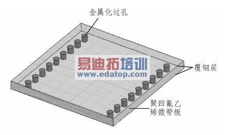 介质基片集成波导实现缝隙天线阵是针对以往采用波导型材实现天线开缝的方法所提出的。使用印刷电路板中常用的金属化过孔的方法,用两排较为密集的金属过孔将聚四氟乙烯微带板(双面覆铜板)的上下两层铜皮连接在一起。此时在两排过孔与上下两层铜皮之间能够导行电磁波,其模式为类似于矩形波导中的TE10模,而不是TEM波。介质板的上下两层金属层等效为矩形波导的两宽边,而两排金属过孔形成矩形波导的窄壁。对于微带板,如果孔和孔之间的距离比较近,就可以将孔之间的空隙看成是波导窄壁上垂直于传播方向的缝隙。这种缝隙不会影响TE10模传播,也不会向外辐射。因此可以用这种方法在微带板上实现矩形波导的功能。