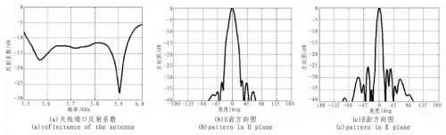 天线方向图见图中6(b)(c)。平板缝隙天线旁瓣指标在H面内,旁瓣电平不超过-30 dB.在E面内,旁瓣电平也低于-25 dB.