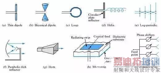 天线大体可分为线天线和口径天线两类。 移动通信用的VHF、UHF天线,大多是以对称振子为基础而发展的各种型式的线天线,卫星地面站接收卫星信号大多用抛物面天线(口径天线)。
