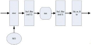 DDC的架构如图2所示,对DDC而言,入口是4个天线下来的数据,经过混频器区分到不同频点上,再由抽取滤波器dec5_filter(41阶)做5倍抽取以及滤波;结果复合到3路上,由3个dec3_filter(61阶)做3倍抽取滤波;最后由ddc_rrc_filter(121阶)做两倍抽取以及滤波。