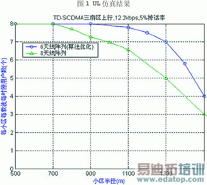 对于容量来说,6阵元天线和8阵元天线同为码道受限系统,由仿真结果可知,在不考虑码道资源受限的情况下,6阵元天线每时隙可支持9个话音用户的极点容量,而TD-SCDMA系统实际上每时隙为16个码道,最多支持8个话音用户(每个话音用户占2个码道),因此,采用6阵元天线与8阵元天线在实际网络容量上没有任何差异。