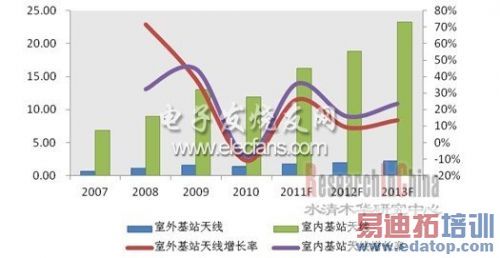 水清木华研究中心指出,2011年中国室外基站天线市场容量约178万套,同比增长26%;室内基站天线市场容量约1620万套,同比增长35%。中国室外基站天线市场竞争激烈,产品价格下滑幅度较大。本土基站天线厂商占据中国基站天线市场份额的85%以上。