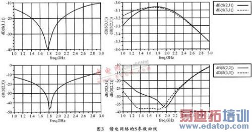 根据式(6)可以得到CRLH-TLs中RH-TLs的结构,再由式(5)、(7)以及匹配阻抗可得到L、C的大小值。取N=2,可得到RH-TLs的长为3.1-mm,LH部分L=11.5 nH,C=4.6 pF。这样,便可使用ADS搭建电路并优化仿真。