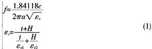 圆形贴片的主模是TMll模,根据上述天线结构,TMll模的场能量集中在空气层。若激励单元的谐振频率为f,激励模式为TMll模。那么,当贴片形状为圆形,激励板半径为a时,则有: