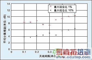 图6:在市区、非LOS环境下,空间分集测量中平均分集增益与天线间隔关系图