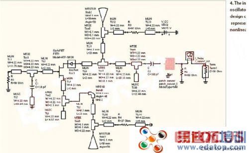 所有接线天线以及振荡器的设计步骤都是并行执行的。在天线旁引入了天线馈线的辐射影响,并且在馈线处的输入阻抗变化作为振荡器设计的输入参数。采用电压串联反馈来将振荡器输出动态范围最大化,并保证保持工作在有源器件的最不稳定区,以满足振荡条件的需要。