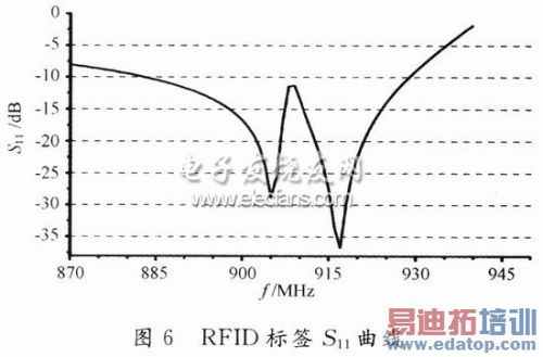 该天线采用的芯片在915 MHz时的阻抗为34.5一j815,呈现明显的容抗。采用Ansoft公司的电磁仿真软件HFSS 10.O对天线进行仿真。经过调试和优化,得到天线的S11曲线,如图6所示。该天线分别在905 MHz和920 MHz有两个谐振频率。在905 MHz时,S11为一28 dB;在920 MHz时,S11为一37 dB,这两个谐振频率都比较窄,通过调整天线,使两个谐振频率靠近915 MHz,以达到增加带宽的目的。该天线增益在915 MHz时仿真结果为0.34 dBi(见图7),满足RFID系统读取的要求。
