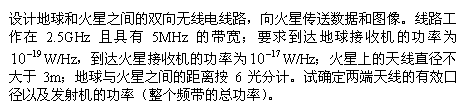 在第二章的习题里面,有道关于火星地球间无线通信的题,不会做,我觉得题目比较有意思,很想弄清楚到底怎么分析,我认为题目好像条件不够啊,连天线是哪种类型都没说清楚,不过感觉可能指的是螺旋天线,因为后面有类似题目中就提到了。