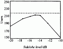 图 7给出了一个8单元等旁瓣针状波束方向图智能天线,当Eb/N<6的出界概率取0.01时,采用不同旁瓣电平方向图的智能天线系统所能支持的用户数曲线. 图中虚线为自适应智能天线所能支持的用户数:218.由图7可见,当旁瓣电平为-20dB时,系统可以支持的用户数为181.随着针状波束方向图旁瓣电平的升高,系统容量增加,当旁瓣电平为-15dB时,系统可以支持的用户数达到最大值:213,仅比采用自适应智能天线的系统少5个.当旁瓣电平超过 -15dB以后,系统容量将随着针状波束方向图旁瓣电平的升高而减小,当旁瓣电平为-10dB时,系统可以支持的用户数为 153.