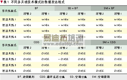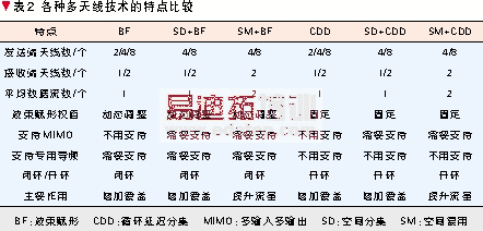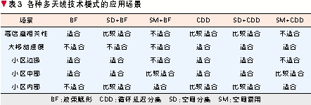CDD、SD+CDD、SM+CDD靠人为引入信道多径时延来获得频域分集增益,他们可以在未知信道状态信息的情况下完成;而BF、SD+BF、 SM+BF则需要估算波束赋形的权值,并要求用户反馈信道状态信息,或利用信道的互易性特点,因此其性能会在很大程度上受权值估计的准确性和及时性影响。 表3总结适合各种多天线技术模式的应用场景[13]。