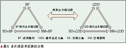 其次,模式切换的类型很多。我们在对多天线技术的性质进行深入分析和大量仿真的基础上,将切换类型分成3类:BF相关技术(BF、SD+BF、 SM+BF)之间的相互切换;CDD相关技术(CDD、SD+CDD、SM+CDD)之间的相互切换;BF相关技术与CDD相关技术之间的切换,如图6所 示。