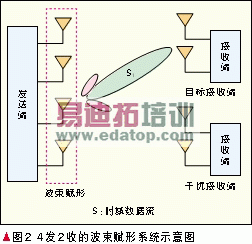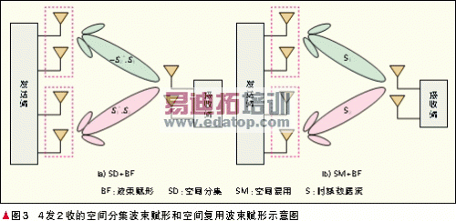波束赋形(BF)是基于自适应天线原理,利用天线阵列通过先进的信号处理算法分别对各物理天线进行加权处理的一种技术。如图2所示,发射端对数据流S1进行加权,并发送出去。在接收端看来,整个天线阵列相当于一根虚拟天线。通过加权处理后,天线阵列形成一个窄发射波束对准目标接收端,并在干扰接收端方向形成零点以减小干扰。