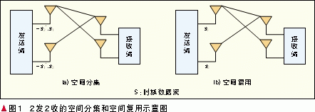 空间分集是在空间引入信号冗余以达到分集的目的。如图1中空间分集所示,发送端通过在两根天线的两个时刻发送正交的信息集合,从而获得分集增益。