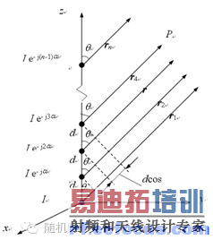 线阵中各个单元天线的类型和取向均相同,且以相等的间隔d排列在一条直线上,且各单元天线的电流振幅相同,相位依次滞后同一数值。